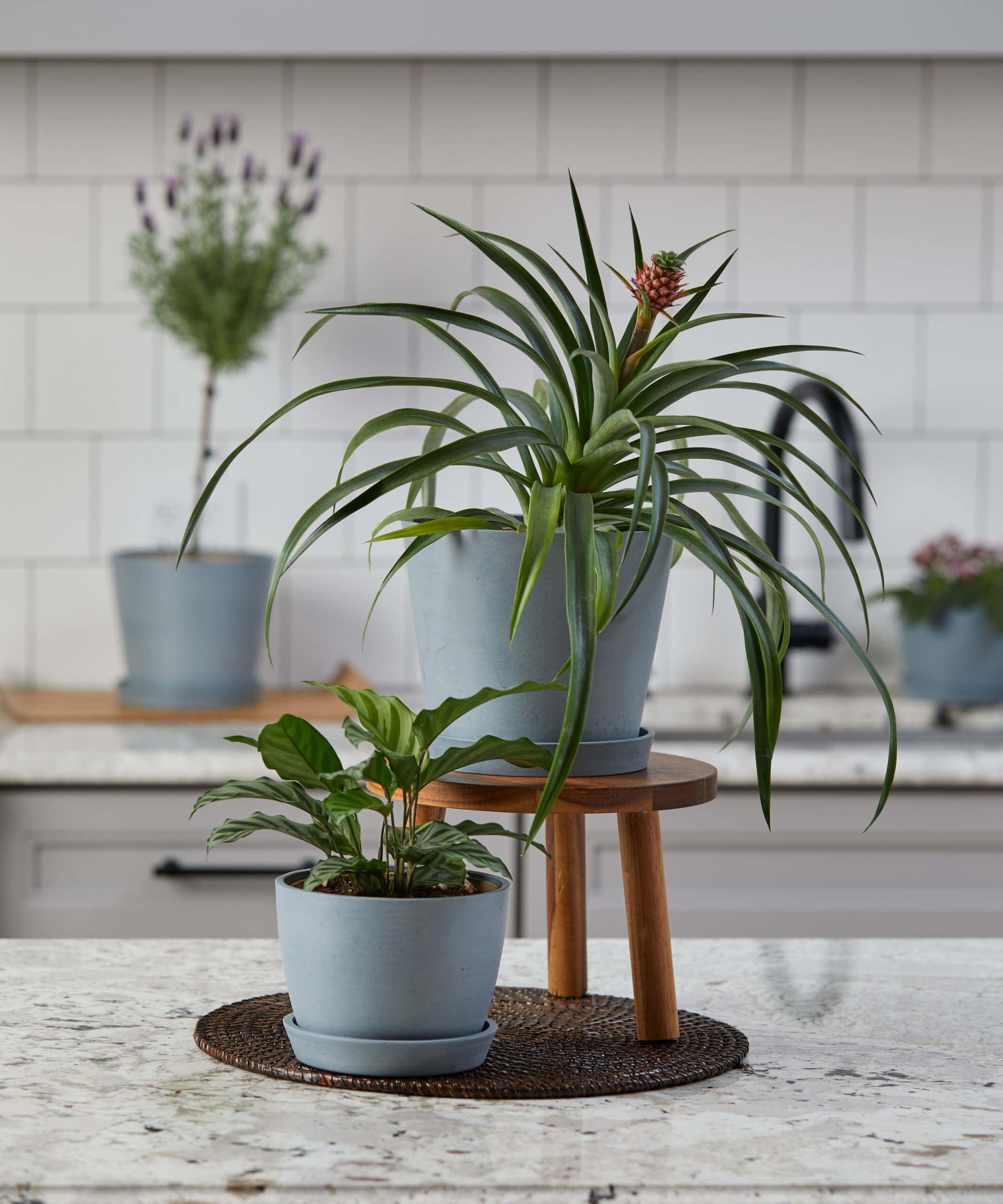 The Bromeliad Pineapple and Calathea Freddie can be placed in low light or indirect bright light to help them grow more quickly. Keep the Calathea’s soil somewhat moist, but the Bromeliad Pineapple likes to dry out almost all the way. These plants both appreciate added humidity which makes them perfect for the kitchen.