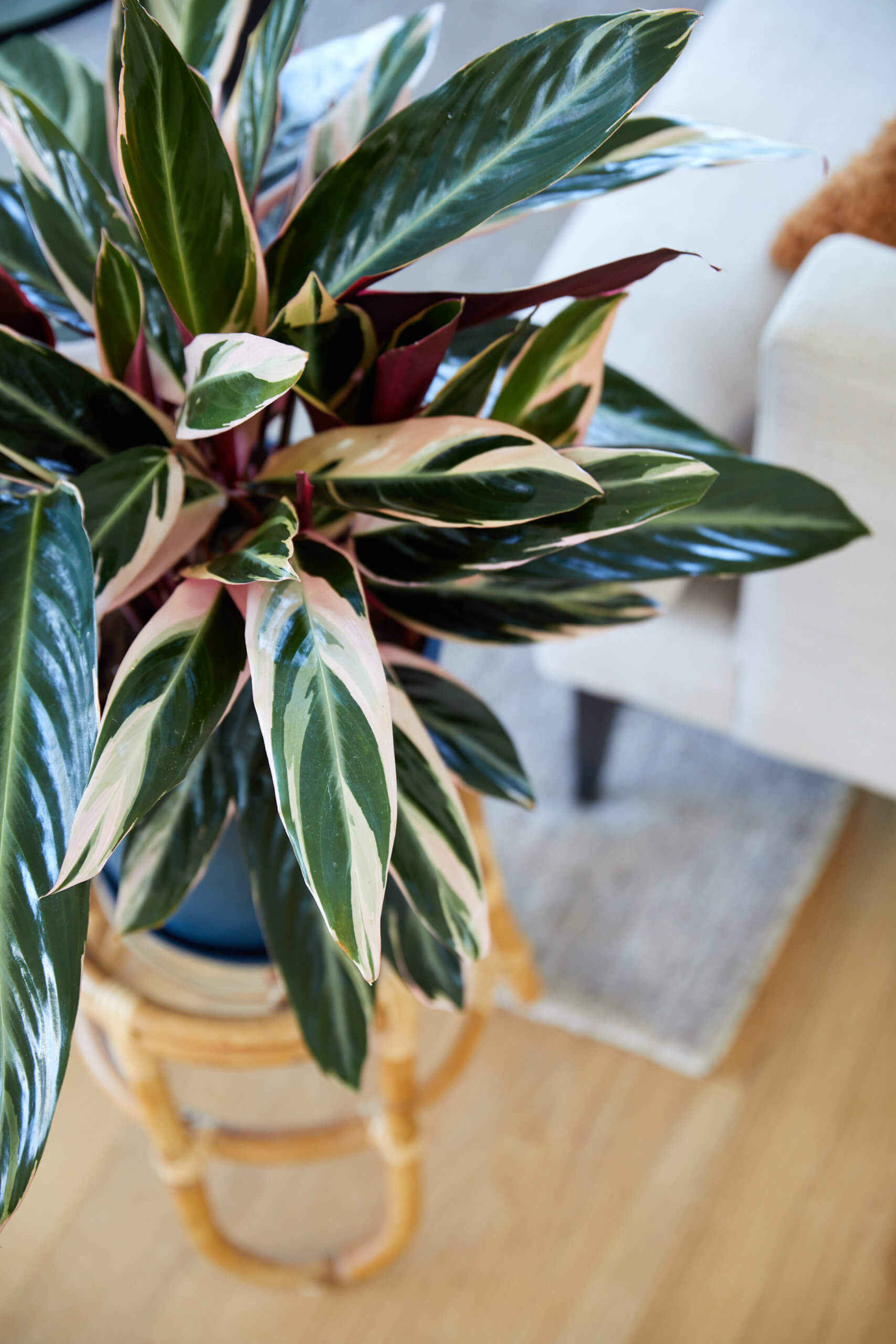 Bring a splash of tropical color to your home by styling the Stromanthe Triostar in a bright living room, cozy reading nook, or sunny bathroom. Its variegated leaves complement neutral tones, wood textures, and natural décor. Pair it with our clay colored pot to highlight its pink and cream accents. For a striking contrast, display it near plants with deep green foliage like a ZZ Plant or Fiddle Leaf Fig.