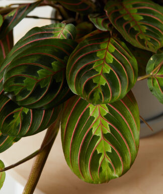 Prayer Plants are native to the tropics of Brazil. They can live in indirect bright light to low light, but colors will be more pronounced with more light. Keep away from drafty areas as they prefer a consistent humid environment—water when the soil is slightly dry to keep the soil evenly moist.